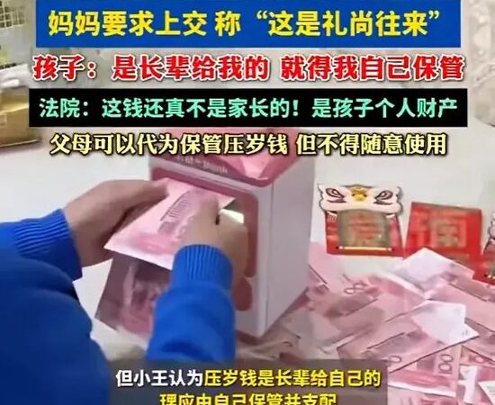 孩子过年收2万元压岁钱,妈妈要求上交称“这是礼尚往来”,孩子不干了 法律解读:压岁钱所有权属于孩子,父母不得随意使用