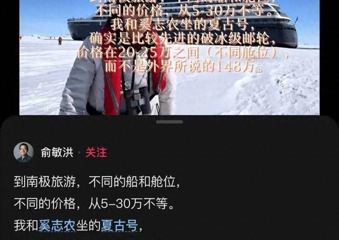据每日经济新闻报道,11月20日,俞敏洪在社交平台发文,辟谣“到南极坐邮轮花148万”,称“员工有不满,我和公司有问题,及时纠正”,还表示,打算明年冬天选10个左右的优秀员工,加上10个东方甄选优秀会员,由公司支持到南极看一看。