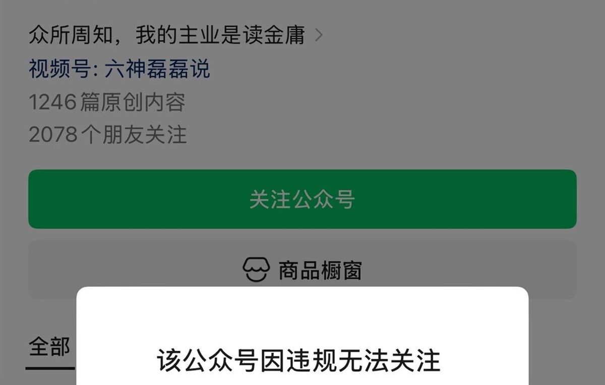 12月14日,知名自媒体人“六神磊磊”名下的微信公众号“六神磊磊读金庸”,因违规导致新用户无法搜索到及关注,已关注用户可正常查看往期文章。目前,其视频号、微博、抖音账号及另一公众号“六神磊磊读唐诗”均运营正常。