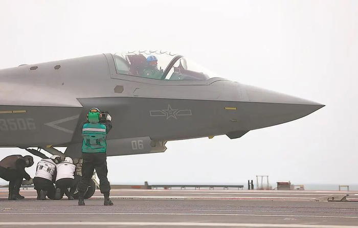歼-35舰载战斗机在福建舰上电磁弹射起飞前,重量板操作员向飞行员核对弹射重量图:新华社