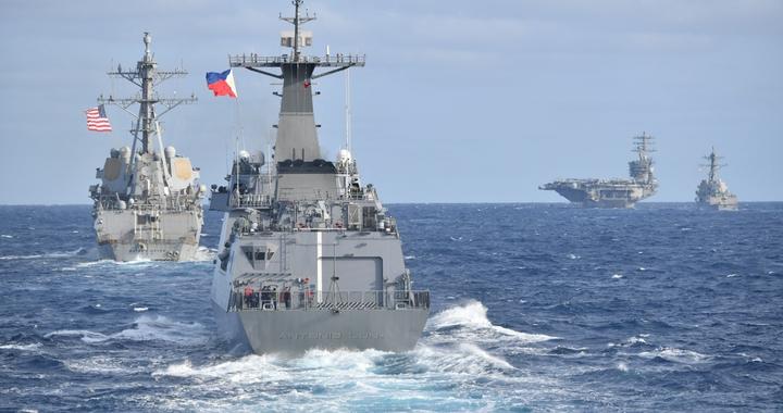 演习当中的“尼米兹”号航母、打击大队属舰和菲律宾海军护卫舰