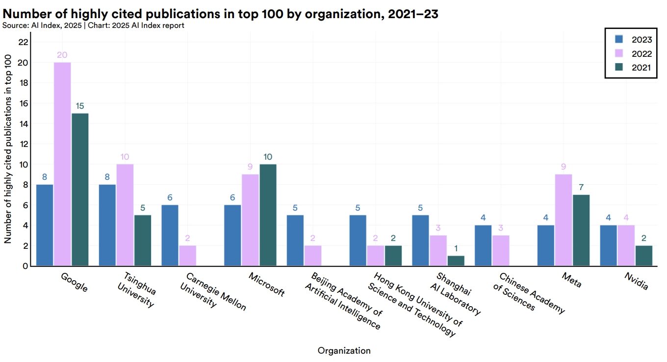 不过目前,美国在人工智能领域仍保有最具影响力的专利与性能最优的模型。例如,在专利影响力排名中,哈佛大学与麻省理工学院始终领先于清华大学。斯坦福大学发布的《人工智能指数报告》也显示,2024年美国科研机构研发的知名人工智能模型达40个,而中国为15个。但在部分性能测评指标上,中国机构正逐步缩小与美国的差距。