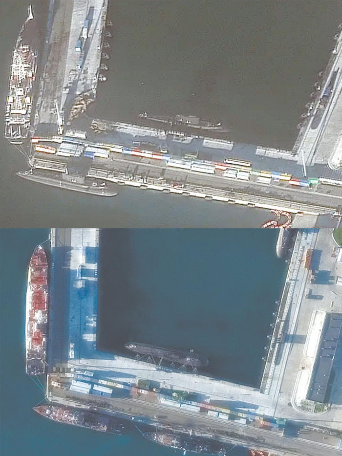 不过,西方媒体发布的袭击后卫星图像显示,一艘改进型“基洛”级潜艇的位置与袭击前相同,袭击发生时停泊在附近的另两艘潜艇已经移动,其他潜艇和舰艇仍然停泊在泊位上,码头受损情况清晰可见。