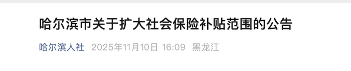 11月10日,哈尔滨市人社局发布《关于扩大社会保险补贴范围的公告》。