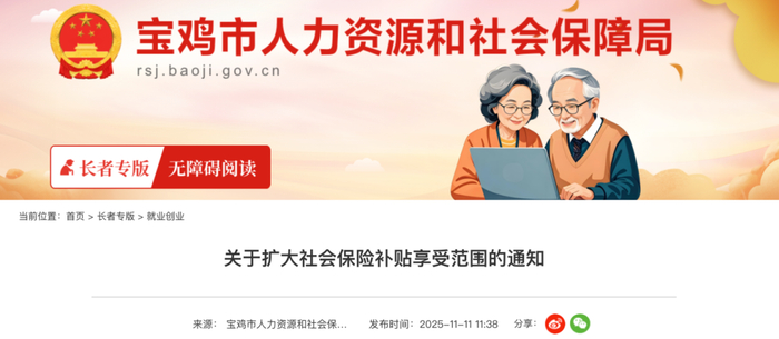 11月11日,宝鸡市人社局发布《关于扩大社会保险补贴享受范围的通知》。