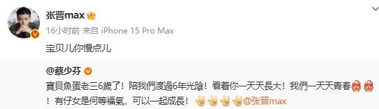 11月16日,蔡少芬发文晒图并@老公张晋,夫妇俩为小儿子庆祝6岁生日:“宝贝鱼蛋老三6岁了!陪我们度过6年光阴!看着你一天天长大!我们一天天青春!有儿女是何等福气,可以一起成长!”