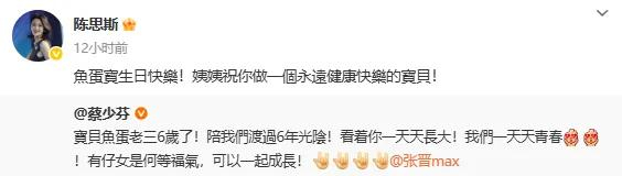 曾在《甄嬛传》中饰演曹琴默的演员陈思斯也送上祝福:“鱼蛋宝生日快乐!姨姨祝你做一个永远健康快乐的宝贝!”