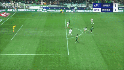 第87分钟,国安打出反击,法比奥禁区右侧小角度抽射破门完成大四喜,北京国安5-1梅州客家。↓