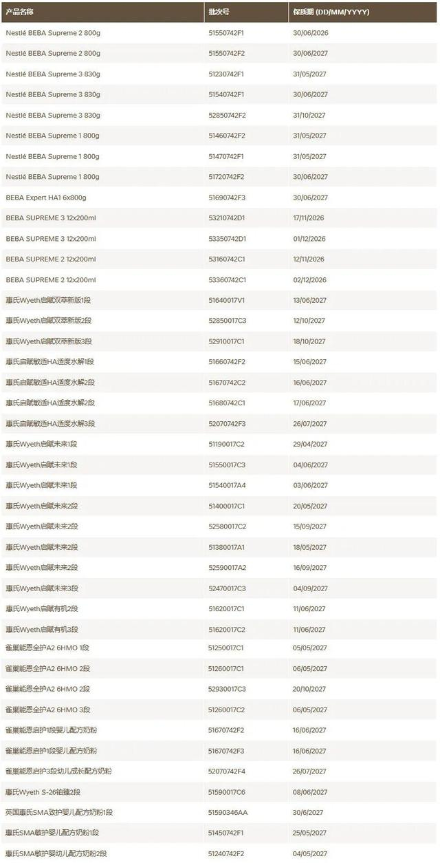 雀巢中国官网发布的“预防性自愿回收婴幼儿配方奶粉”公告披露了需要召回的产品批次,涉及力多精、铂初能恩、舒宜能恩、惠氏等多批次产品。公告称,自愿回收所有此次涉事的进口自欧洲、在中国大陆跨境电商渠道销售的婴幼儿配方奶粉。本次回收范围之外的所有其他雀巢产品及同类产品的其他批次均可安全食用。