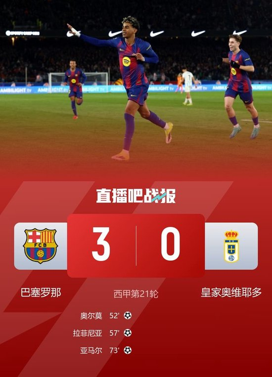 上半场,莱万错失多次不错机会。下半场,皇家奥维耶多两度失误送礼,奥尔莫和拉菲尼亚先后建功,随后亚马尔精彩侧钩锁定胜局。最终巴塞罗那以3-0完胜皇家奥维耶多。