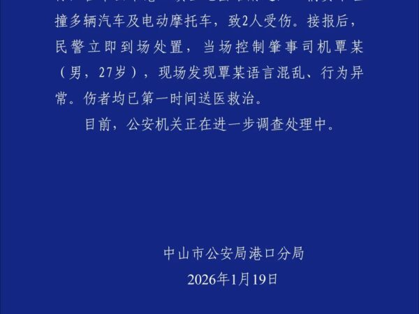 继续阅读2026年1月19日晚,广东中山市港口镇一辆白色货车逆行撞击多辆汽车及电动摩托车,造成2人受伤。肇事司机覃某被警方现场控制,现正进一步调查处理中。