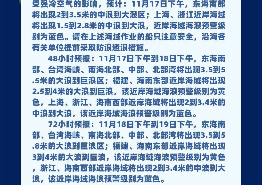 继续阅读国家海洋预报台于11月16日16时发布海浪蓝色预警,受强冷空气影响,11月17日下午东海南部海浪高度将达2到3.5米,上海及浙江近岸海域海浪将达1.5到2.8米。相关海域船只和沿海单位需加强防范,确保安全。