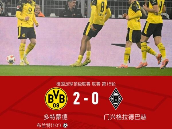 北京时间12月20日,德甲第15轮比赛中,多特蒙德主场以2-0战胜门兴格拉德巴赫。布兰特第10分钟接聚勒助攻凌空破门首开纪录,比赛末段第90+6分钟拜尔低射破门锁定胜局。比赛中多特蒙德多次威胁对方球门,门将尼古拉斯也有多次关键扑救,最终多特蒙德凭借出色表现拿下胜利。