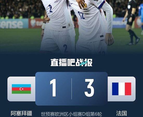 北京时间11月17日,世预赛欧洲区D组第六轮比赛中,法国客场3-1战胜阿塞拜疆。阿塞拜疆达达绍夫第4分钟先拔头筹,法国由古斯托助攻马特塔和阿克利乌舍分别在第17分钟和第30分钟连入两球反超比分,第45分钟阿塞拜疆马哈马得利耶夫乌龙,半场法国3-1领先。下半场双方均未改写比分,最终法国队3-1取胜。